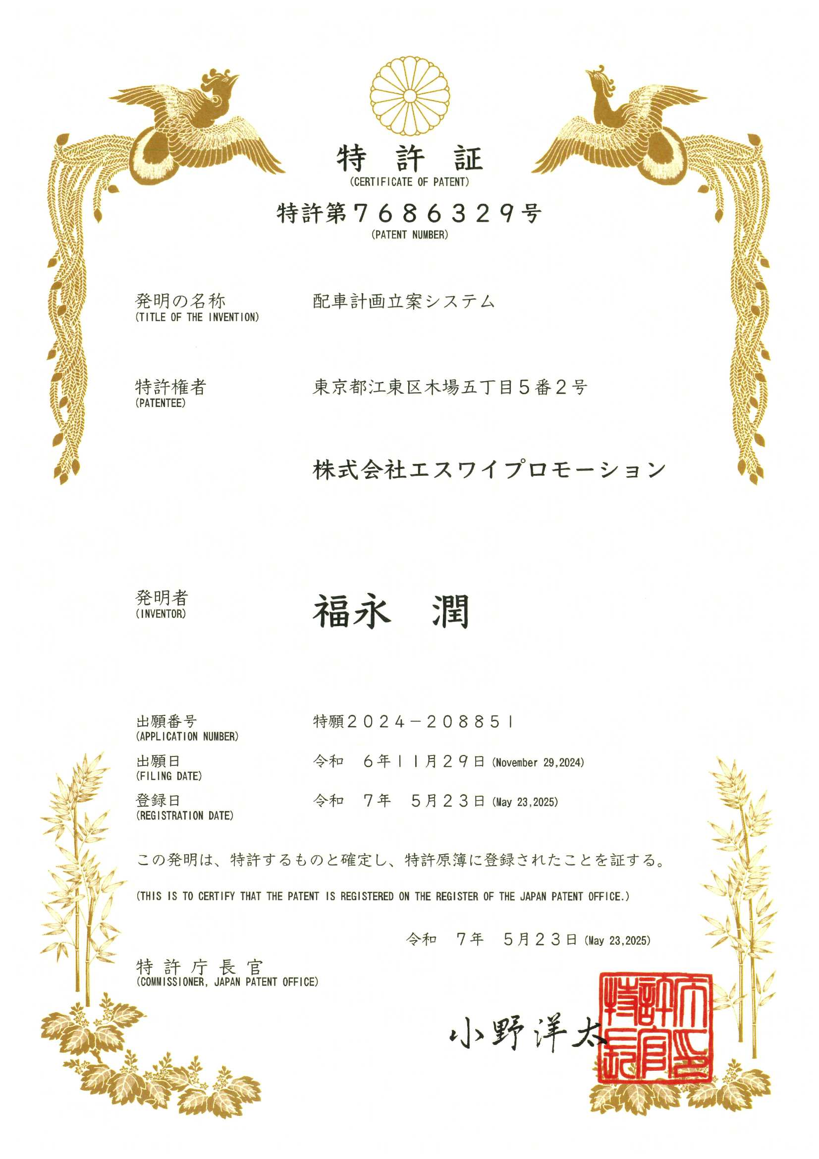 バルク輸送の配車計画立案システムで特許を取得いたしました。 当社はバルク輸送における熟練配車ノウハウを特許化しました。属人業務を標準化し、生産性向上と業務効率化を推進してまいります。 |